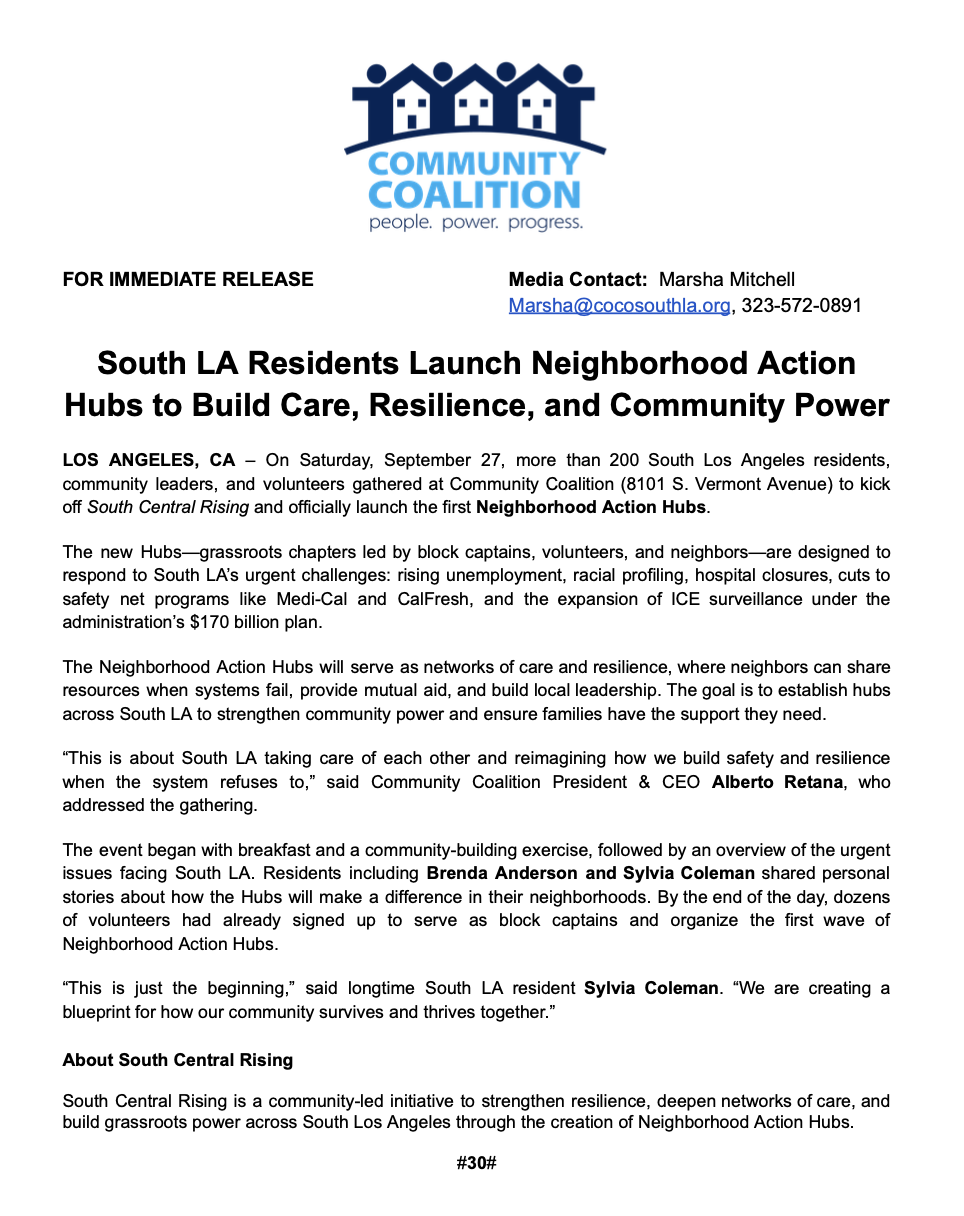 South LA Residents Launch Neighborhood Action Hubs to Build Care, Resilience, and Community Power Author Community Coalition Published on: September 29, 2025